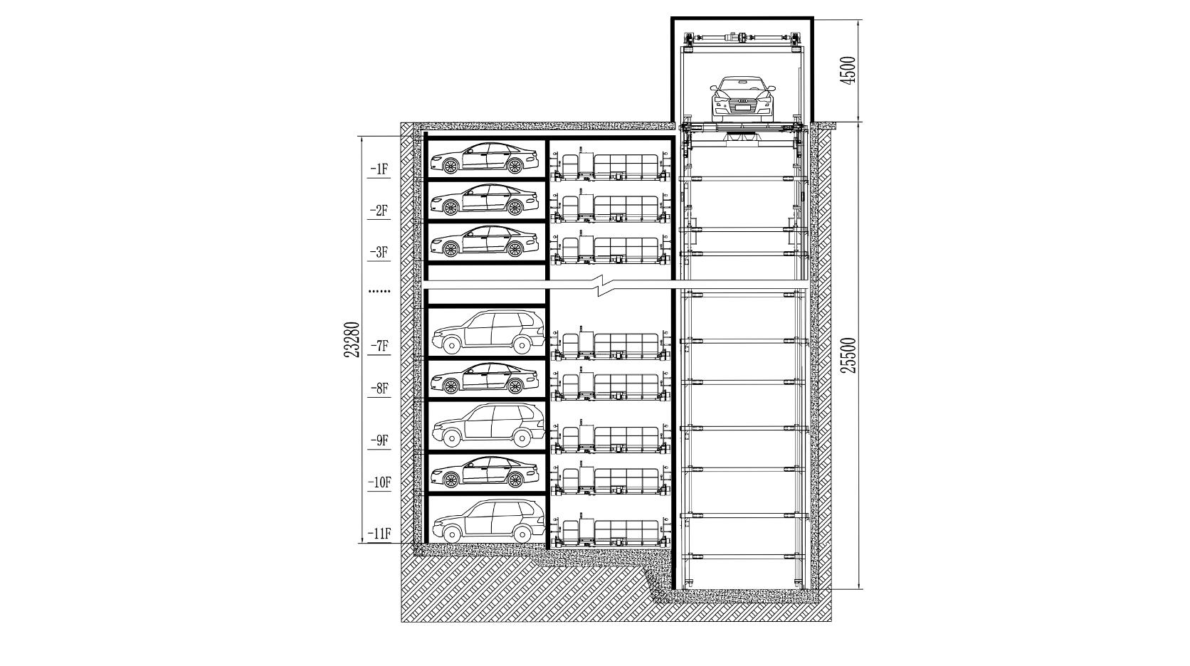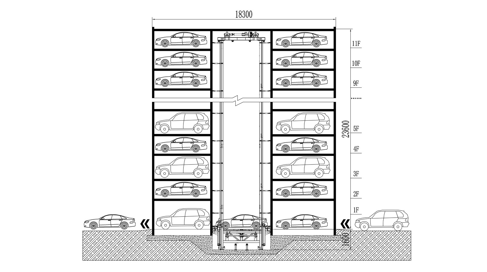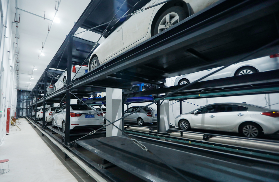 该设备通过固定位置的升降机实现汽车的竖直移动。同一层上,通过横移台车实现汽车的横向移动,通过载车板式智能搬运器实现汽车的纵向移动,实现多层车辆的同时存取。该设备是一种自动化、大型仓储化立体车库,容车密度大,存取车快捷,使用范围广,可根据场地不同,选择不同类型的升降机及出入口装置,例如双板交换式升降机、无机房贯通式升降机、巷道中置升降机、巷道端置升降机等。