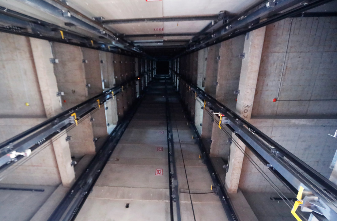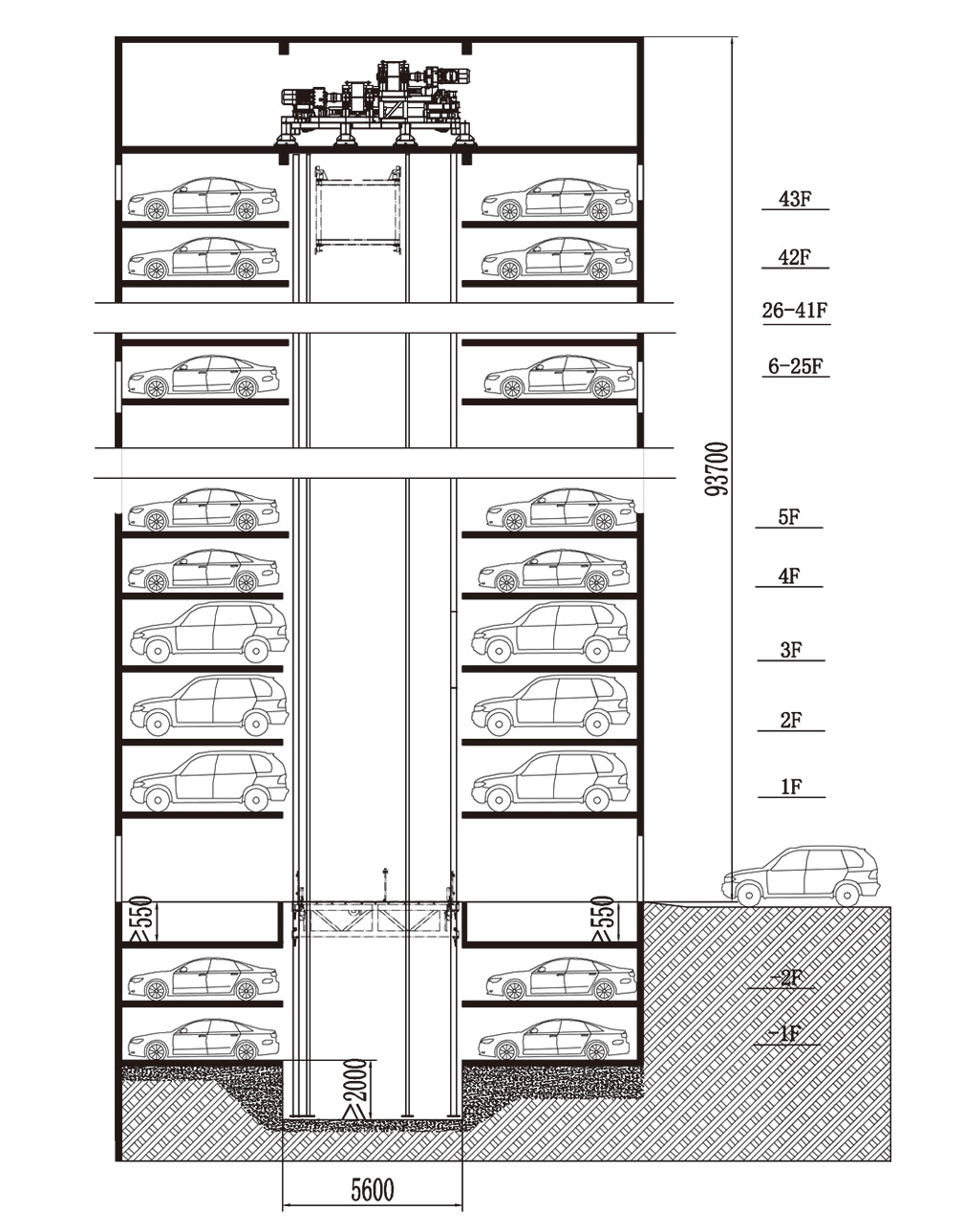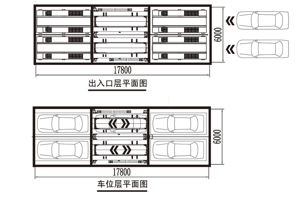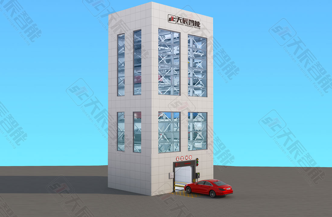 该设备亦称为塔式或电梯式机械停车设备,车库呈矩形布置,结构分为提升通道和泊位;提升通道内设智能搬运器和升降设备,泊位分布于提升通道两侧。首先通过升降设备将智能搬运器以及其上的车辆提升或下降到指定层面,再通过智能搬运器将车移入移出泊车位,实现车辆的存入取出。出入口室设置于地面层升降通道内,如设有固定回转盘,可实现车辆调头,保证车辆前进入库出库。