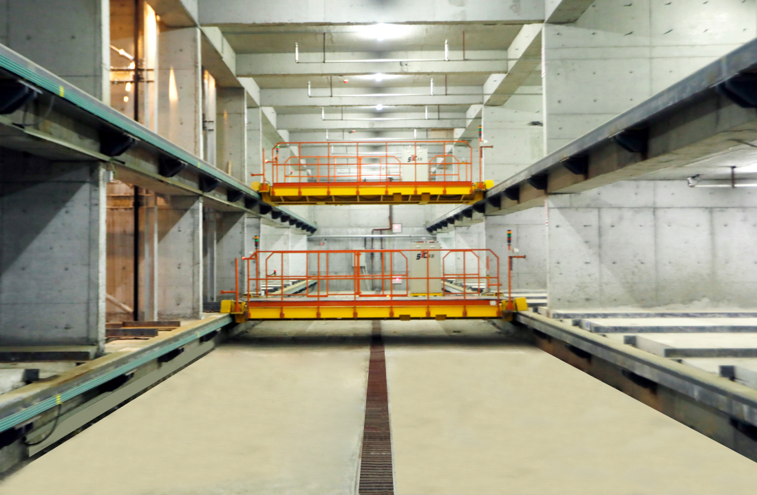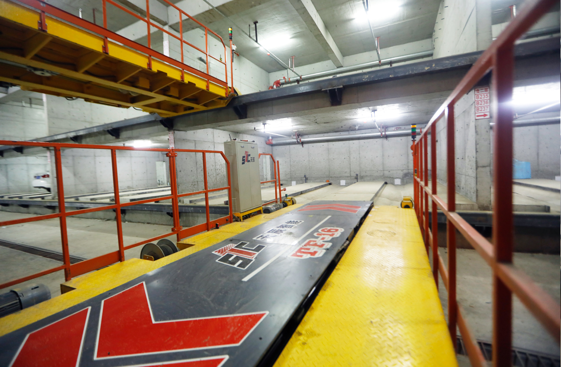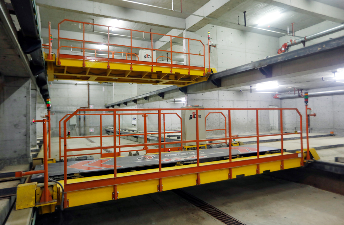 该设备通过固定位置的升降机实现汽车的竖直移动。同一层上,通过横移台车实现汽车的横向移动,通过抱夹式智能搬运器实现汽车的纵向移动,实现多层车辆的同时存取。该设备是一种自动化、大型仓储化立体车库,容车密度大,存取车快捷,使用范围广,可根据场地不同,选择不同类型的升降机及出入口装置,例如无机房贯通式升降机、升降回转式升降机、巷道中置升降机、巷道端置升降机等。在升降机及出入口不具备回转条件时,也可实现巷道回转,保证车辆满足正进正出。